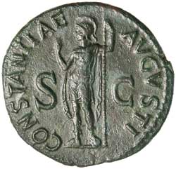 CLAUDIUS, (A.D. 41-54), AE as, Rome mint, issued A.D. 42, (8.97 g), obv. bare head of Claudius to left, around TI CLAVDIVS CAESAR AVG PM TR P IMP P P, rev. CONSTANTIAE AVGVSTI, Constantia standing to left, holding sceptre, SC across in field, (S.1858, RIC 111, BMC 199, C.14). Dark green patina, very fine.
