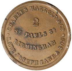 CHARLES HARROLD AND CO., Late Joseph Lane and Son, Birmingham halfpenny, thin flan (9.01g)(A-; Hyde -; R.187). Obverse rim damage, otherwise extremely fine and extremely rare.
