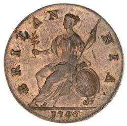 GEORGE II, old head, halfpenny, 1746 (S.3719). Nearly full original mint red uncirculated and rare in this condition, one of the finest known.
