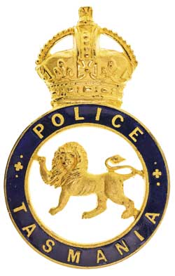 TASMANIAN POLICE, Inspector's cap badge, c1930, in gilt and enamel (42x65mm) by J.R.Gaunt London. Extremely fine.