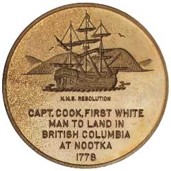 CAPTAIN JAMES COOK, R.N. F.R.S. 1728-1779, (1979), in pure copper (51mm), obverse, bust of Cook right, reverse, H.M.S.Resolution at anchor with mountains in background, below, 'Capt. Cook First White/Man To Land In/British Columbia/At Nootka/1778'. Uncirculated.