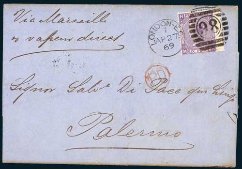 ITALY, covers all fixed with stamps to mostly Palermo and Napoli etc, mostly posted from various cities in Sicily and Italy, dated 1880, 1889, 1891 - 1897, 1905, 1915, 1919, 1922, 1925, together with a cover from London to Palermo via Marseille, Ap 27, (18)69 fixed with a 6d pl.8 (SG 109 CV ?140), all in a display book. Used, scarce. (20)