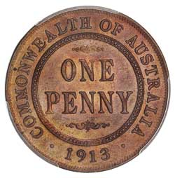 GEORGE V, 1913. Mostly subdued mint red uncirculated and rare in this condition, one of the finest known.