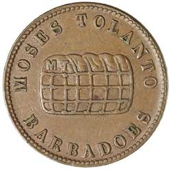 BRITISH WEST INDIES, Barbados, Moses Tolanto, farthing, (Pr.28; Lyall 95; Rulau 12). Nearly extremely fine ...