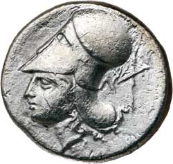 ACARNANIA, Leucas (Colony of Corinth), (320-280 B.C.), silver stater, (7.82 g), obv. Pegasos with pointed wing flying to right, **L* below, rev. head of Athena to left in Corinthian helmet over a leather cap, with stylis (mast and yard arm) and **L behind head, (cf.S.2282, Calciati 145 [p.430], cf.BCD 262.1). Polished and bright, with rough surface, otherwise very fine a rare variant.