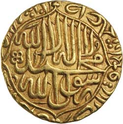 INDIA, Mogul, Muhammad Akbar (A.H. 963-1014, A.D. 1556-1605), gold mohur, (10.86 g), Dar-ul-Khilafat Lahore mint, dated AH 976 (1569), (KM.106.4). Extremely fine, short on flan as usual.