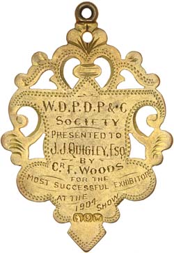 W.D.P.D.P & C. (Williamstown District Poultry Dog Pigeon & Canary) Society, prize fob handcrafted in voided gold (9ct; 7.41g; 30.5x40mm), no maker, ring top suspension, obverse inscribed 'JJQ', reverse inscribed 'W.D.P.D.P & C/Society/Presented to/J.J.Quigley, Esq/by/Cr. F.Woods/For The/Most Successful Exhibitor/At The/1904/Show'; also locket with ribbon and attached shield (locket tests as 9ct; tot wt 14.55g), obverse inscribed 'JJQ', reverse inscribed 'Presented/To/J.J.Quigley./by his/Mother./April 13th 1883.', inside is a cracked and faded b&w photo (presumably of J.Quigley). Very fine; fine. (2)