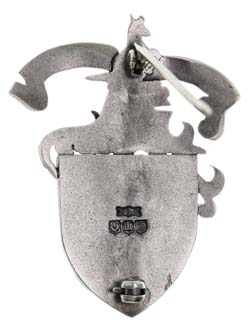 BLACK FAMILY COAT OF ARMS BADGE, Australian version with kangaroo at top between motto Via Crusis Via Lucis (Cross the Path of Light), in silver (34x46mm), pin-back, hallmarked for Edinburgh 1955, by maker 'M&C' (Mackay & Chisholm, Edinburgh). Nearly uncirculated.
