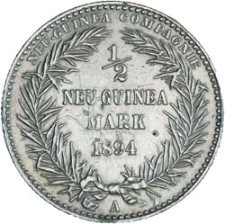 GERMAN NEW GUINEA, half mark, 1894A. Cleaned, minor damage, otherwise good very fine.