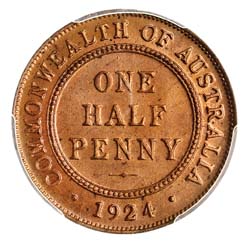 GEORGE V, Melbourne Mint proof halfpenny, 1924. Toned obverse, brilliant mint red reverse, FDC and ...