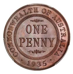 GEORGE V, Melbourne Mint proof penny, 1935. Toned unevenly on obverse, even brown brilliance on the reverse, FDC and rare.