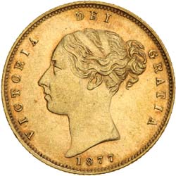 QUEEN VICTORIA, young head, half sovereign, 1877 die no 26 (S.3860D). Good extremely fine.