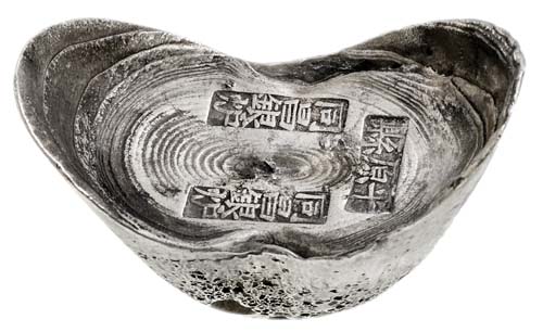 CHINA, Ch'ing Dynasty (1644-1911), silver boat shaped sycee ingot, similar to type Shandong Province Pure Silver Ingot, eight taels or eight ounce type, (315 g), with two small blocks of Chinese characters as stamps within and a set of three characters at top, (cf.Cribb 158 [Pl.37] for similar size and type). Very fine and rare.