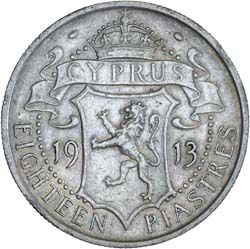 CYPRUS, George V, eighteen piastres, 1913 (KM.14). Lightly toned, nearly very fine/very fine.