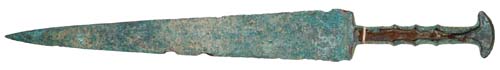 LURISTAN SWORD, c1000-600BC, in bronze with integral handle which is missing most wood inlay. With oxidation as usual and a few chips in blade, otherwise good.