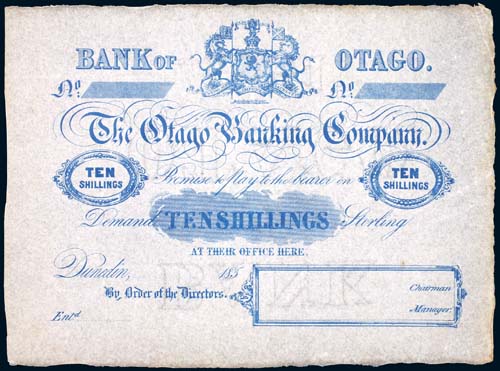 THE OTAGO BANKING COMPANY, only issue, ten shillings, Dunedin, undated 185-, not numbered, no imprint, watermark inverted Bank of Otago (Robb.P.T.U.14a, P.S336, Sutherland pp.185 and other pages, Hargreaves pp.65-75, Clifford U811). Extremely fine and scarce.