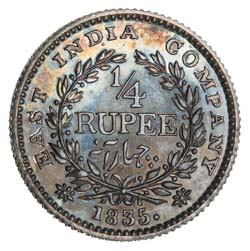 INDIA, British, EIC, William IV, silver proof restrike quarter rupee, 1835, milled edge, F raised, (2.91 g), Calcutta mint, (KM.446.6). Toned, with additional multi-coloured patination, FDC and very scarce.