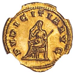 HERENNIA ETRUSCILLA WIFE OF TRAJAN DECIUS, (A.D. 249-251), gold aureus, Rome mint, (4.60 g), obv. diademed and draped bust to right, around HER ETRUSCILLA AVG, rev. Pudicitia seated to left, drawing veil from face and holding transverse sceptre, around PVDICITIA AVG, (S.9489, RIC 59A, C.18, Calico 3308). Extremely fine and very rare.