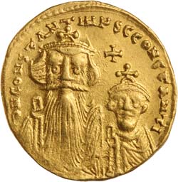 HERACLIUS, with Heraclius Constantine and Heraclonas, (610-641), gold solidus (4.45 g), Constantinople mint, 5th officina, ...