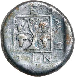 (10.90 g), obv. horse rearing to left, with trailing rein, bucranium above, rev. [E**P*I N]EO MH NIO* around a grape arbor of four bunches all in a linear square, all within shallow incuse square, (cf.S.1628, Schonert-Geiss 432, SNG Copenhagen -, HGC 3, 1533 [lists magistrate but not the symbol], CNG Mail Bid Sale 47 [lot 267 this coin]). Very fine, unpublished for symbol, known for this magistrate, probably unique as type for die combination.