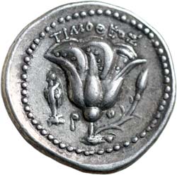 CARIA, Island of, Rhodus, (c.250-230 B.C.), silver didrachm, (6.70 g), obv. radiate head of Helios three-quarter face to right, hair loose in locks, rev. inside dotted circle, rose with bud to right, above **TIMOQEOS* to left terminal figure facing half left (Silenos drinking from Askos), P O to left and right, (cf.S.5048, BMC 150-2 [p.244, pl.xxxviii, 8], Ashton Series 4 [RN 1988 p.79 chronology c.250-230 B.C.], Ashton [Money in Ancient Greek world] 209 [p.106], SNG Keckman [Finland 1] 540-541 [Pl.19], SNG Cop.767-8 [Pl.18], SNG Von Aulock 2808). Toned, extremely fine and rare.