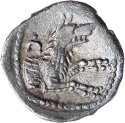 CILICIA, probably Tarsos, (4th century B.C.), silver obol (Sear suggests three-quarter obol), (0.70 g), obv. Baal seated to left holding ear of corn and bunch of grapes, rev. forepart of wolf to right, crescent inverted above, (S.5660, SNG Levante 223, 226, SNG France 443-6). Round, grey toning, nearly extremely fine and scarce.