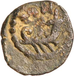 PALESTINE, Judaea, Herod Archelaus I, (4 B.C. - A.D. 6), copper two prutah, AE 16, (1.47 g), probably Jerusalem mint, obv. double cornucopiae, around traces of HPW**O [U]*, dotted border, rev. war galley to left, with oars, cabin, curving at bow, aphlaston at stern, above traces of inscription **EQN*AP/ HX/ C, dotted border, (S.5537, AJC 3/3c var. [p.240], RPC 4914, H.503 [61], BMC 3, Meshorer 59). Very fine and very rare in this condition.
