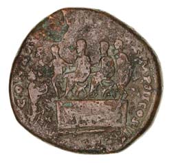 MARCUS AURELIUS, (A.D. 161-180), AE sestertius, Rome Mint, issued 166, (23.01 g), obv. laureate head to right, around M AVREL ANTONINVS AVG [ARMENIACVS P M], rev. CONG A[VG III TR POT] XX IMP III COS III around, COS III in exergue, [S C] in exergue, Marcus Aurelius and Lucius Verus seated left on curule chairs atop platform with prefect behind, before them an official standing left holding abacus and distributing dole to a man who stands on the steps of the platform, (S.4964, RIC.914, C.75), Brown and green patina, surface marks and pitting, good fine and a very rare type. $$ Ex Dr V.J.A. Flynn Collection. This rare type commemorates the Congiarium - a personal gift of cash from the Emperor to the people.