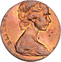 ELIZABETH II, two cents 1975 struck on a one cent blank in error. Nearly uncirculated. ...