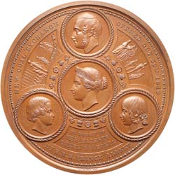 OPENING OF THE NEW COAL EXCHANGE, London, 1849, in bronze (89mm) by Benjamin Wyon, obverse, bust of Queen Victoria left in centre medallion, surrounded by busts of Prince Albert, Prince Albert Edward Prince of Wales and the Princess Royal within medallions, inscription around, reverse, detailed view of the Coal Exchange interior within ornamemtal border, City of London shield and motto below, issued by the Corporation of London, in case of issue gold blocked on outside of lid 'In Commemoration Of/The Opening of/The New Coal Exchange/MDCCCXLIX' within open floral wreath (Eimer 1435, BHM 2357). Nearly FDC.