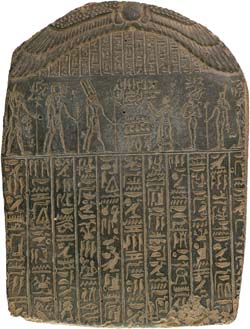 EGYPT, Late Middle Kingdom, (c2040-1782BC), marl clay, round topped stela of Heriheb with a winged uraeus, sixteen columns of hieroglyphs above a register of figures (including Heriheb and six deities) and eleven columns of hieroglyphs below. Slightly damaged on the lower right edge.