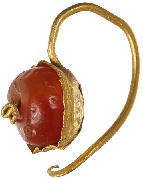 ROMAN, 2nd - 3rd century A.D., gold earring, the central wire terminating in a cup-shaped bowl containing a carnelian sphere secured with twisted gold wire, diameter 17mm. Very fine, intact and rare.