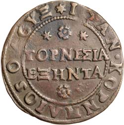 ITALY, Venice, coinage for Candia (Crete), Giovanni Cornaro (Doge of Venice 1625-29), sixty tornesi or four soldi (29.5mm; 6.16g), obverse, rosette between two stars at top and rosette at bottom, reverse, winged lion of S. Marco standing left with Book of Gospel, in exergue the value (IIII) between two stars (CNI VIII, 166; Paolucci 892; Papadopoli 131). Good very fine.