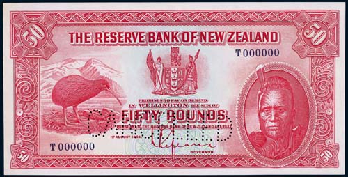 RESERVE BANK OF NEW ZEALAND, L. Lefeaux, specimen fifty pounds, 1st August 1934, T000000 (P.157), ...