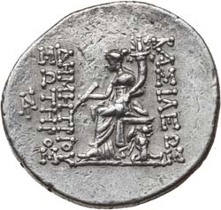 SYRIA, Kingdom of, Demetrius I, (162-150 B.C.), silver tetradrachm, (16.71 g), Antioch mint, series II, second issue, issued 162-155/4 B.C., obv. diademed head of Demetrius to right within laurel wreath border, rev. Tyche seated to left with leg of throne a winged monster, holds sceptre and cornucopiae, to right **BASILEWS, to left **DHMH TRIOU, and **SWTHROS, monogram ANT to far left, (cf.S.7014, SC 1640b, Newell SMA 100, SNG Israel I (Spaer) 1264, HGC 9, 797). Bright, nearly extremely fine, scarce.