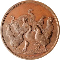 N.S.W. Poultry, Pigeon, Canary & Dog Society, 1889, in bronze (53.5mm) by Ottley Birmm, inscribed on reverse 'N.S.W./Poultry, Pigeon/Canary & Dog/Society/Awarded To/W.Baker/B.G.Duckwing Cock/1891'. Toned extremely fine.