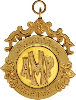 AMP (AUSTRALIAN MUTUAL PROVIDENT [SOCIETY]) INDUSTRIAL DEPARTMENT, fob medal handcrafted in gold (15ct; 8.41g; 28x25mm), ...