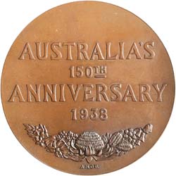 AUSTRALIA'S 150TH ANNIVERSARY, 1938, in bronze (51mm) (C.1938/17), by Amor. Uncirculated and scarce in bronze.