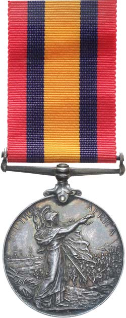 QUEEN'S SOUTH AFRICA MEDAL 1899, (type 3 reverse), with pin-back bar attached to ribbon and ...