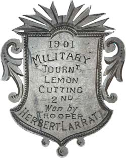 AUSTRALIA, Military Tournament prize medal in silver (27x34mm), stamped S.S, ring top suspension missing, obverse inscribed, '1901/Military/Tournt/Lemon/Cutting/2nd/Won by/Trooper/Herbert Larrat. (and scratched T) (obviously the Trooper's name is Larratt)', reverse inscribed, 'First/Mounted Cadets/In/Australia/Est Enfield/1900.' Toned, very fine.