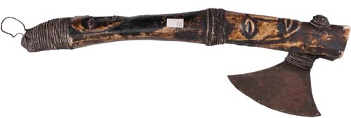 AFRICA, Baule, Ivory Coast, 20th century, ceremonial bronze axe, the bone handle carved with the images of faces, (390mm long). Very fine.