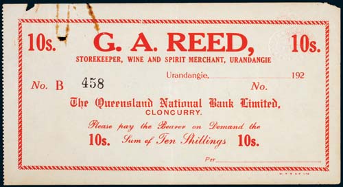 TEN SHILLINGS, calabash of G.A.Reed, Urandangie, Queensland, No B 458, 192-, unissued note (MVR 2nd eds p.83). Paper clip rust stain, very fine and rare.