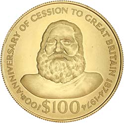 FIJI, Elizabeth II, Mint .500 fine gold one hundred dollars, 1974, 100th anniversary (KM.35). Uncirculated. ...