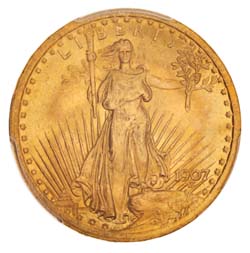 USA, TWENTY DOLLARS OR DOUBLE EAGLE, 1907, St. Gaudens, no motto, Arabic numerals. Choice uncirculated.