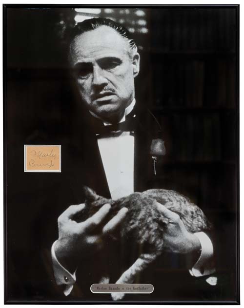 MARLON BRANDO, ballpoint signature, "Marlon Brando", on tan album page (approx 5.5x7.5cm), matted with a poster of Brando as Don Corleone from The Godfather (approx 68.5x52cm), framed under glass (approx 54.5x70cm). Fine.