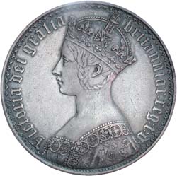 QUEEN VICTORIA, Gothic crown, 1847, undecimo edge (S.3883). Toned, obverse fields rubbed, otherwise extremely fine/good extremely fine.