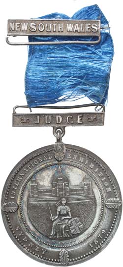 INTERNATIONAL EXHIBITION SYDNEY, 1879, uniface, in silver (38mm), by W.Burtt, 'Judge' bottom suspension bar and 'New South Wales' pin-back top suspension bar, reverse inscribed, 'A.Gilles.'. With original dilapidated ribbon, a few very small edge nicks and hairlines, otherwise extremely fine and very rare.