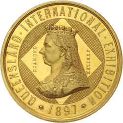 QUEENSLAND?INTERNATIONAL?EXHIBITION,?QUEEN Victoria Diamond Jubilee, 1897, in gilt bronze (46mm) (C.1897/9), by Stokes & Sons, unnamed.?Nearly uncirculated.
