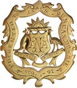 AUSTRALIAN NATIVES ASSOCIATION, badge in voided gold (15ct; 5.70g; 24x28mm), no maker, pin-back but pin missing, obverse inscribed, 'ANA' in centre of shield, in wreath around, 'Presented To James. Duncan. Downie/1900-01'. Good fine.