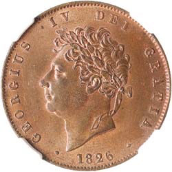 GEORGE IV, second issue, copper halfpenny, 1826 (S.3824), two incuse lines on saltire. With brilliant mint red, uncirculated.